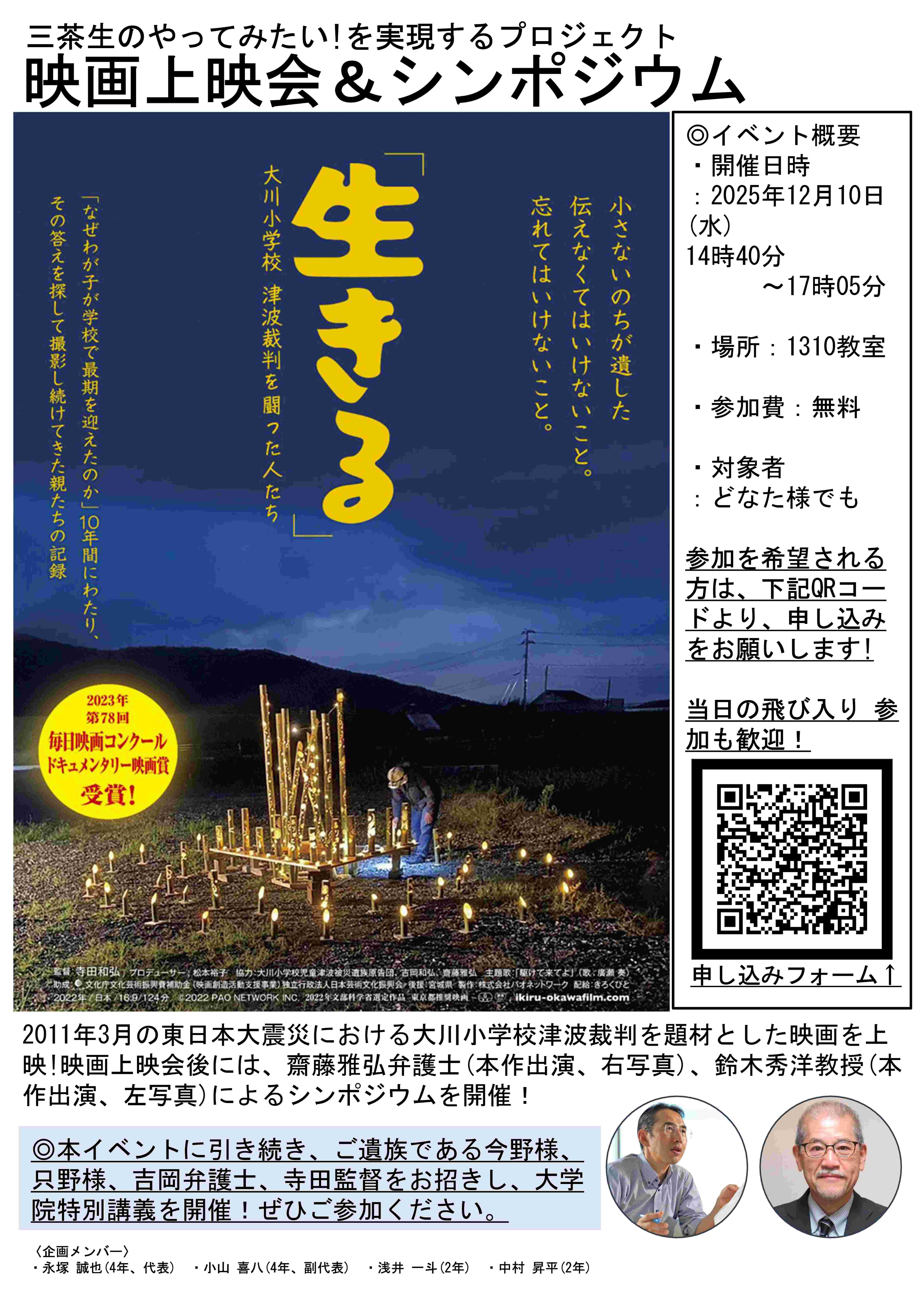 なお、本講義は、[第1部企画]三茶生のやってみたい!を実現するプロジェクト「映画「生きる」上映会&シンポジウム」(同日14:40〜17:05)に続く、第2部企画として行われます。
