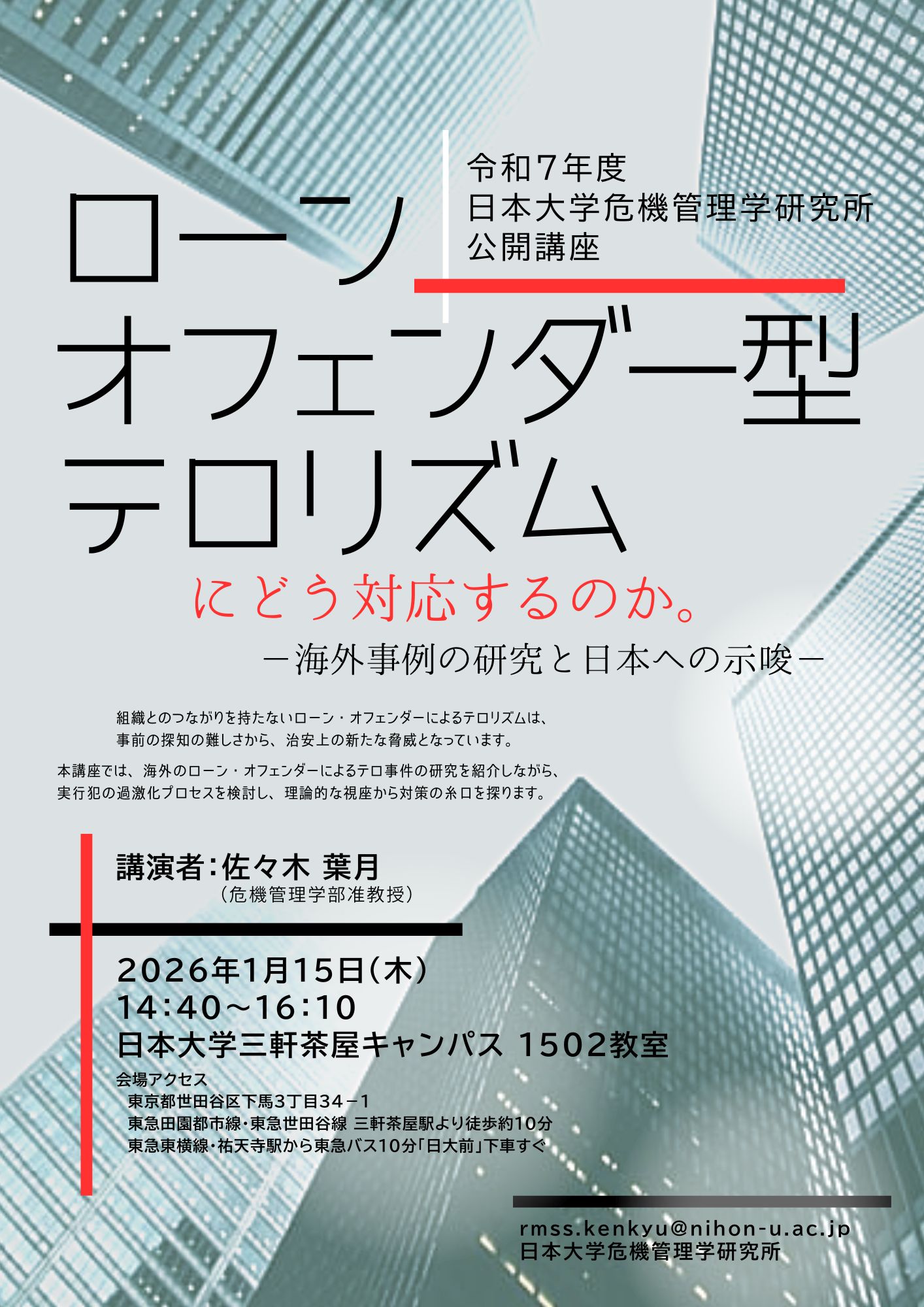 本講座では,海外のローン・オフェンダーによるテロ事件の研究を紹介しながら,実行犯の過激化プロセスを検討し,理論的な視座から対策の糸口を探ります。